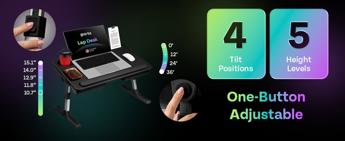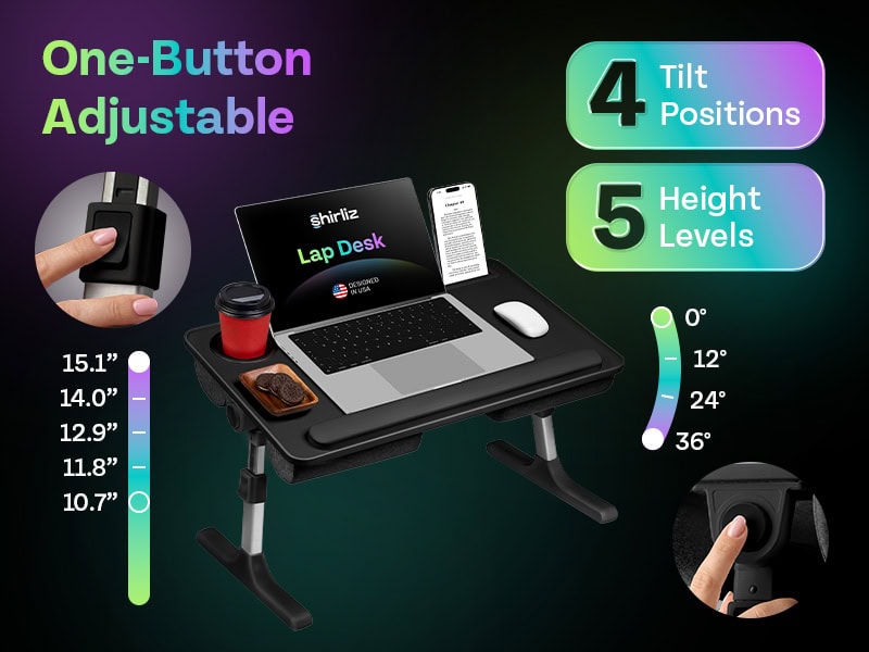 Customize your laptop table bed angle and height for comfortable work. Designed for long work or study sessions, this lap desk for adults helps support proper posture and includes wrist support.