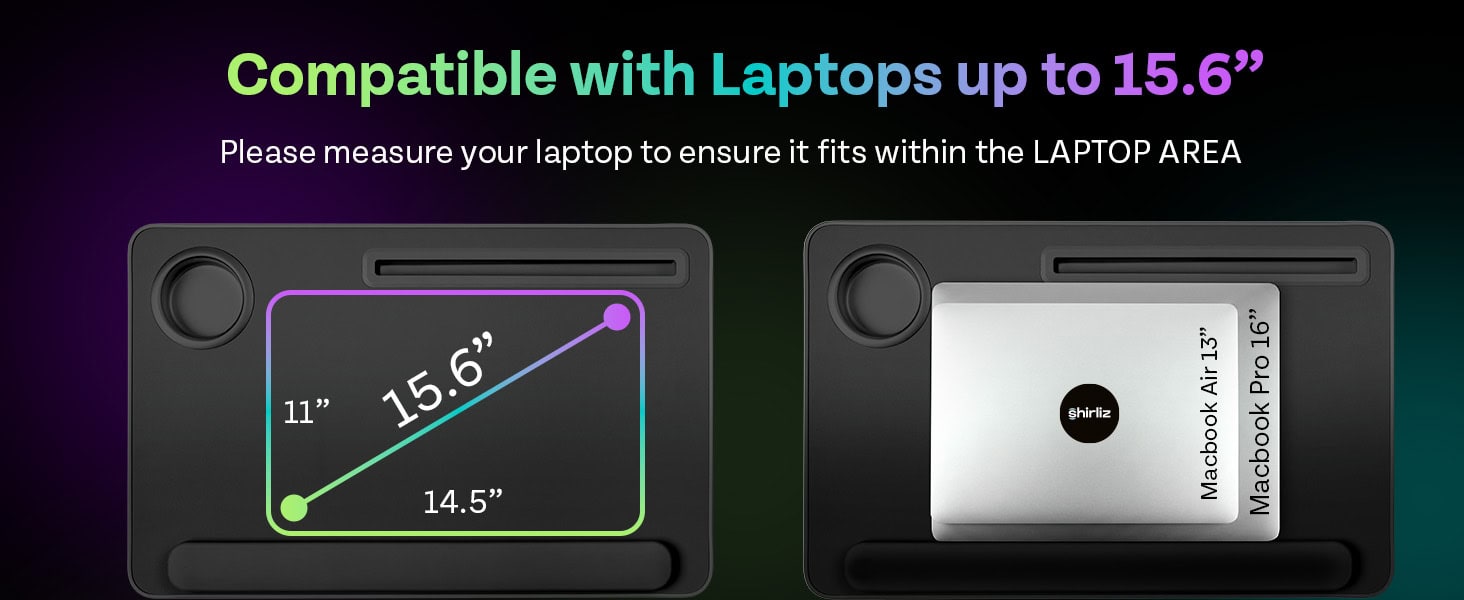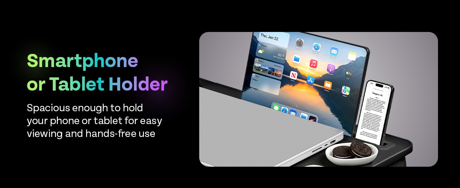 One for your drink, one for your phone or tablet. The portable laptop desk for couch, designed in the USA, comes with holders to keep your drink from tipping and your device always in view on the laptop tray.